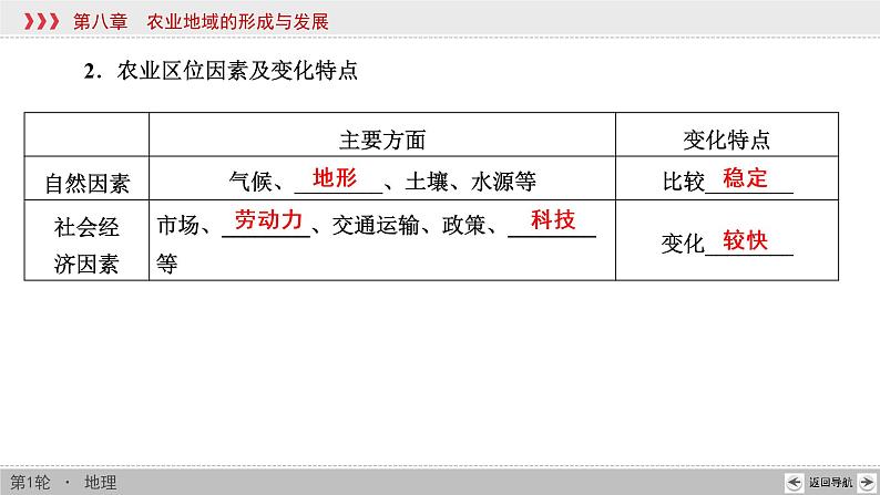这是一份新高中地理高考第8章 第1讲 农业的区位因素 课件练习题,共60页。PPT课件主要包含了地理位置,地理环境,劳动力,合理利用,地域差异,因地制宜,发展方向,耕作业,平坦开阔,考点一农业区位因素等内容,欢迎下载使用。