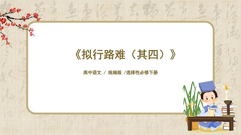 这是一份高中语文人教统编版选择性必修 下册古诗词诵读拟行路难(其四)完美版课件ppt,文件包含1古诗诵读一《拟行路难其四》课件pptx、1古诗诵读一《拟行路难其四》教学设计docx、1古诗诵读一《拟行路难其四》练习docx等3份课件配套教学资源,其中PPT共25页, 欢迎下载使用。