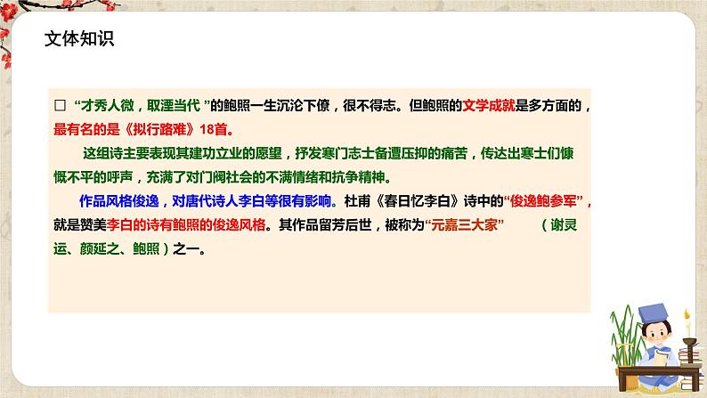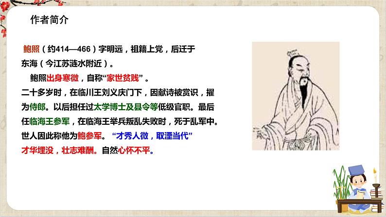 鲍照(约414—466)字明远,祖籍上党,后迁于东海(今江苏涟水附近)。 鲍照出身寒微,自称“家世贫贱” 。二十多岁时,在临川王刘义庆门下,因献诗被赏识,擢为侍郎。以后担任过太学博士及县令等低级官职。最后任临海王参军,在临海王举兵叛乱失败时,死于乱军中。世人因此称他为鲍参军。 “才秀人微,取湮当代”才华埋没,壮志难酬。自然心怀不平。