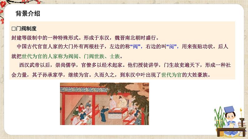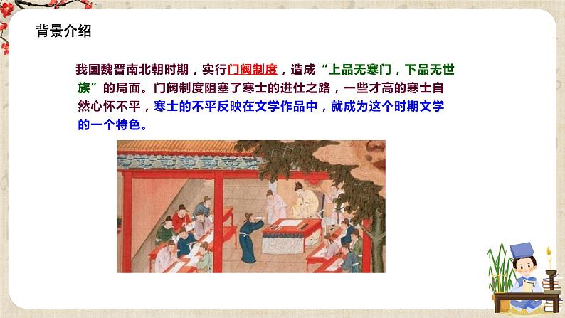 我国魏晋南北朝时期,实行门阀制度,造成“上品无寒门,下品无世族”的局面。门阀制度阻塞了寒士的进仕之路,一些才高的寒士自然心怀不平,寒士的不平反映在文学作品中,就成为这个时期文学的一个特色。