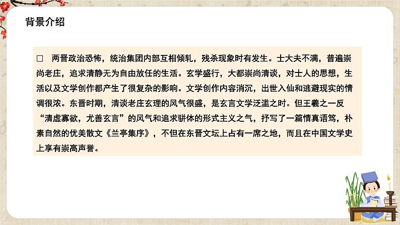 两晋政治恐怖,统治集团内部互相倾轧,残杀现象时有发生。士大夫不满,普遍崇尚老庄,追求清静无为自由放任的生活。玄学盛行,大都崇尚清谈,对士人的思想,生活以及文学创作都产生了很复杂的影响。文学创作内容消沉,出世入仙和逃避现实的情调很浓。东晋时期,清谈老庄玄理的风气很盛,是玄言文学泛滥之时。但王羲之一反“清虚寡欲,尤善玄言”的风气和追求骈体的形式主义之气,抒写了一篇情真语笃,朴素自然的优美散文《兰亭集序》,不但在东晋文坛上占有一席之地,而且在中国文学史上享有崇高声誉。