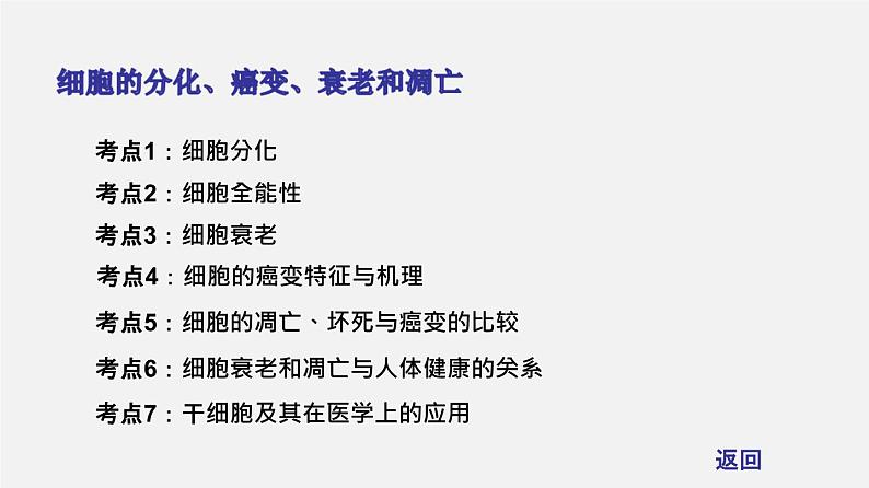 2024届人教版高考生物一轮复习细胞的分化、衰老、凋亡和癌变课件: 这是一份2024届人教版高考生物一轮复习细胞的分化、衰老、凋亡和癌变课件,共60页。PPT课件主要包含了稳定性差异,一个或一种,遗传信息的执行情况,选择性表达,普遍存在,整个生命,胚胎时期,分化后,mRNA,蛋白质等内容,欢迎下载使用。