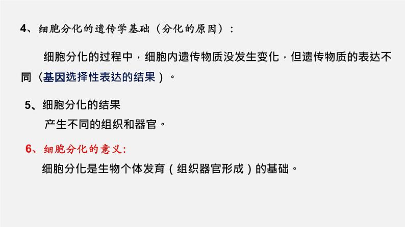 持久性:细胞分化是一种稳定性的变化,贯穿于生物体整个生命进程中,在胚胎期达到最大限度。