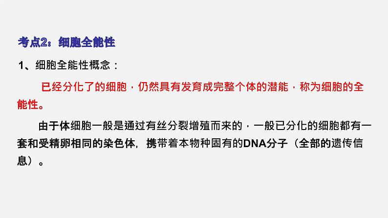 已经分化了的细胞,仍然具有发育成完整个体的潜能,称为细胞的全能性。 由于体细胞一般是通过有丝分裂增殖而来的,一般已分化的细胞都有一套和受精卵相同的染色体,携带着本物种固有的DNA分子(全部的遗传信息)。