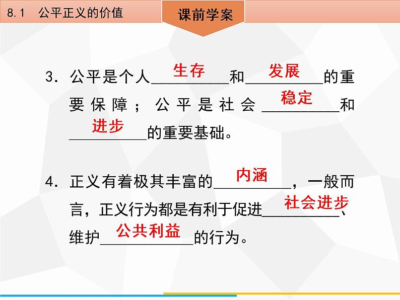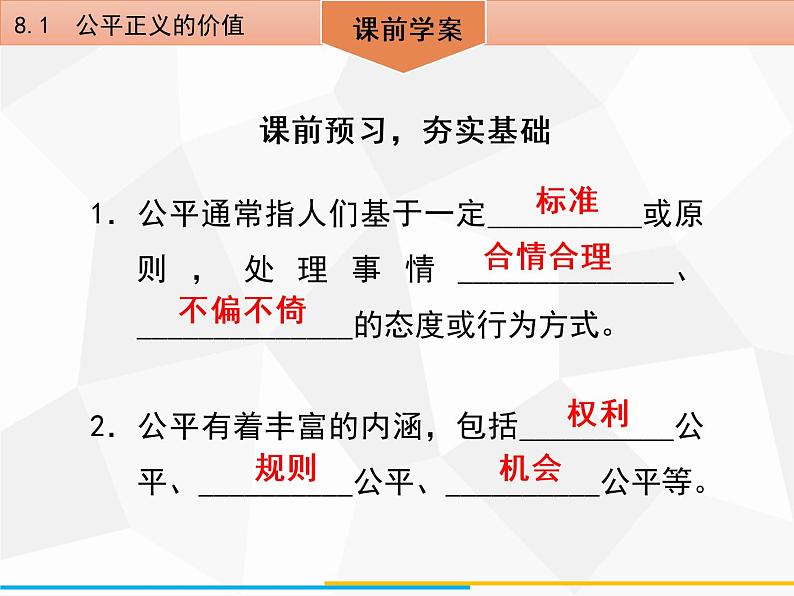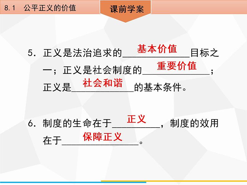 这是一份初中第四单元 崇尚法治精神第八课 维护公平正义公平正义的价值备课ppt课件,共42页。PPT课件主要包含了导学案等内容,欢迎下载使用。