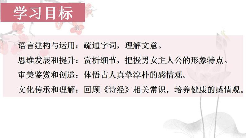 展开人教统编版必修 上册静女教案配套ppt课件: 这是一份人教统编版必修 上册静女教案配套ppt课件,共38页。PPT课件主要包含了课标要求,诗经六义,辨析手法,邶风﹒静女,解读《静女》等内容,欢迎下载使用。