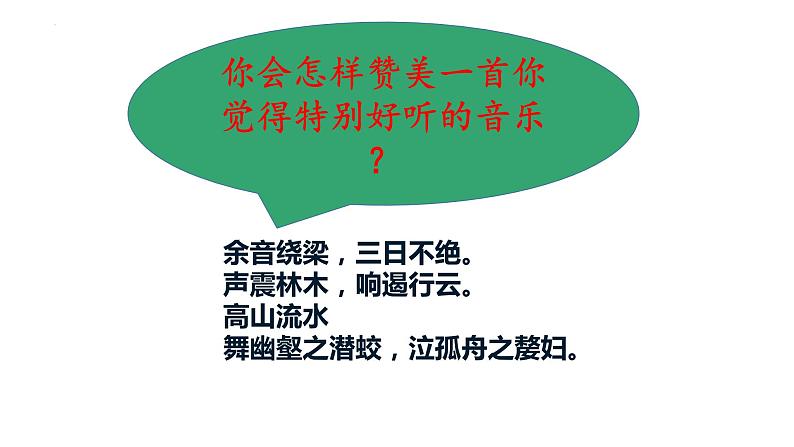 正面描写1.描摹声音(运用拟声词、叠词)比喻(以声写声)通感(以形写声,化听觉为视觉,使抽象的乐声具体可感。)夸张、拟人、联想、想象等2.描写音乐旋律的变化 《明湖居听书》中说唱过程则是:声音不甚大,随后越唱越高,拔个尖儿,然后回环转折,节节高起,继而于极高处陡然一落,声音变得渐低渐细,直至无声,却忽又扬起,最后霍然收音。3.描写演奏者的动作、神态等。4.描写乐器材质。侧面描写(音乐效果)1.通过听众(或其他事物)的感受或反应来表现音乐的感染力。2.通过环境烘托。