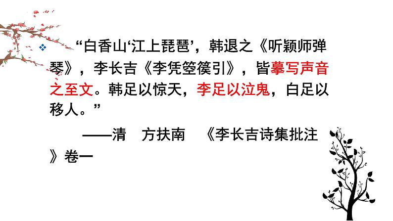 “白香山‘江上琵琶’,韩退之《听颖师弹琴》,李长吉《李凭箜篌引》,皆摹写声音之至文。韩足以惊天,李足以泣鬼,白足以移人。” ——清 方扶南 《李长吉诗集批注》卷一