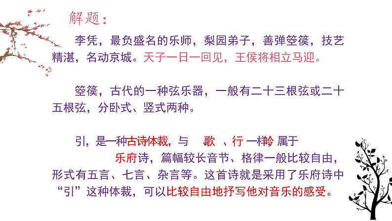 李凭,最负盛名的乐师,梨园弟子,善弹箜篌,技艺精湛,名动京城。天子一日一回见,王侯将相立马迎。箜篌,古代的一种弦乐器,一般有二十三根弦或二十五根弦,分卧式、竖式两种。引,是一种古诗体裁,与 、 、 一样,属于 乐府诗,篇幅较长音节、格律一般比较自由,形式有五言、七言、杂言等。这首诗就是采用了乐府诗中“引”这种体裁,可以比较自由地抒写他对音乐的感受。