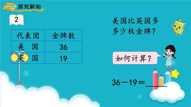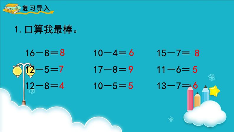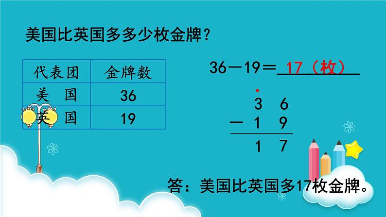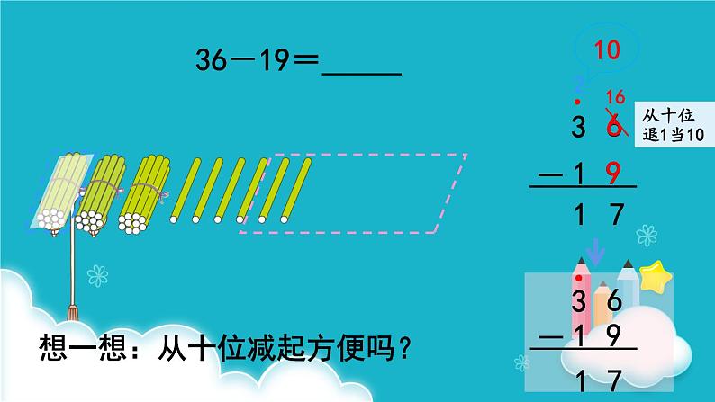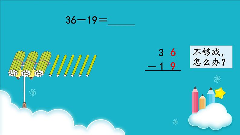这是一份人教版二年级上册退位减多媒体教学课件ppt,共17页。PPT课件主要包含了口算我最棒,算一算连一连,怎样列式,如何计算,-19,-24=,-24,算一算,-26,-26=等内容,欢迎下载使用。