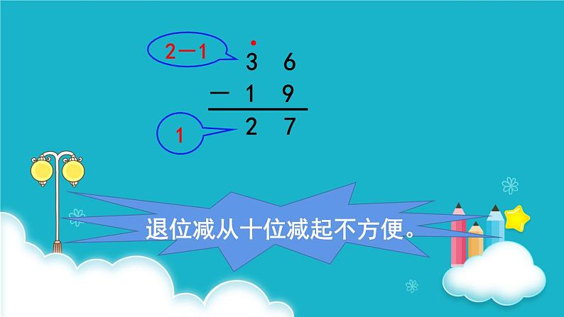1.相同数位对齐,从个位减起。2.个位不够减时,从十位退1当10,再计算。3.十位退1后要先减1,再计算十位上的减法。