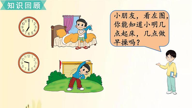 小朋友,看左图,你能知道小明几点起床,几点做早操吗?
