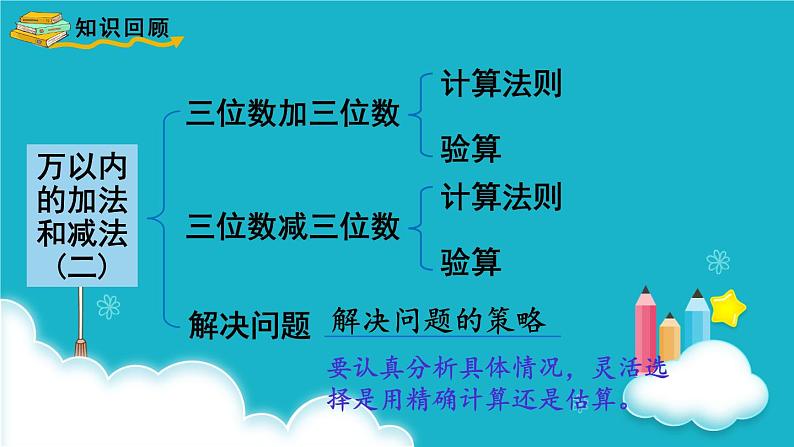 这是一份数学人教版1 时、分、秒复习课件ppt,共17页。PPT课件主要包含了知识回顾,三位数加三位数,计算法则,三位数减三位数,解决问题,解决问题的策略,①相同数位对齐,②从个位加起,②从个位减起,知识点3解决问题等内容,欢迎下载使用。