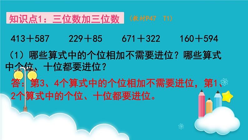 (1)哪些算式中的个位相加不需要进位?哪些算式中个位、十位都要进位?