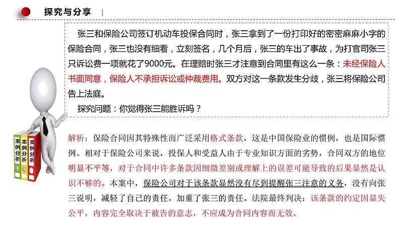 解析:保险合同因其特殊性而广泛采用格式条款,这是中国保险业的惯例,也是国际惯例。相对于保险公司来说,投保人和受益人由于专业知识方面的劣势,合同双方的地位明显不平等,对于合同中许多条款因细微差别或理解上的误差可能导致的后果显然是认识不够的。本案中,保险公司对于该条款显然没有尽到提醒张三注意的义务,没有向张三说明,减轻了自己的责任,加重了张三的责任。法院最终判决:该条款的约定因显失公平,内容完全取决于被告的意志,不应成为合同内容而无效。
