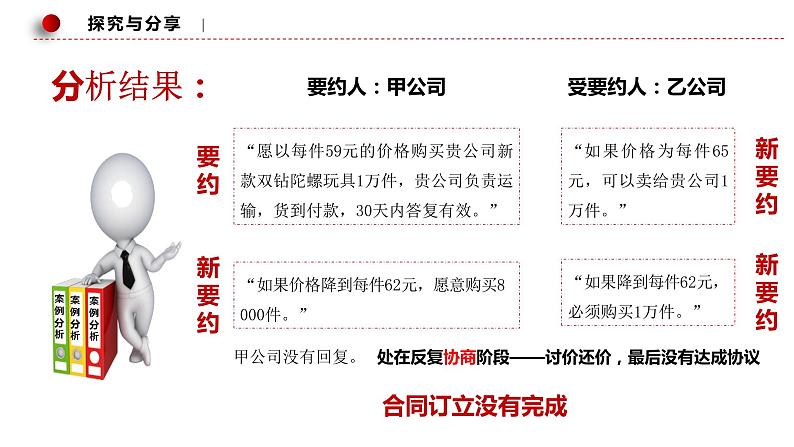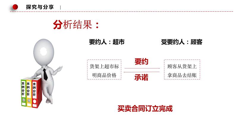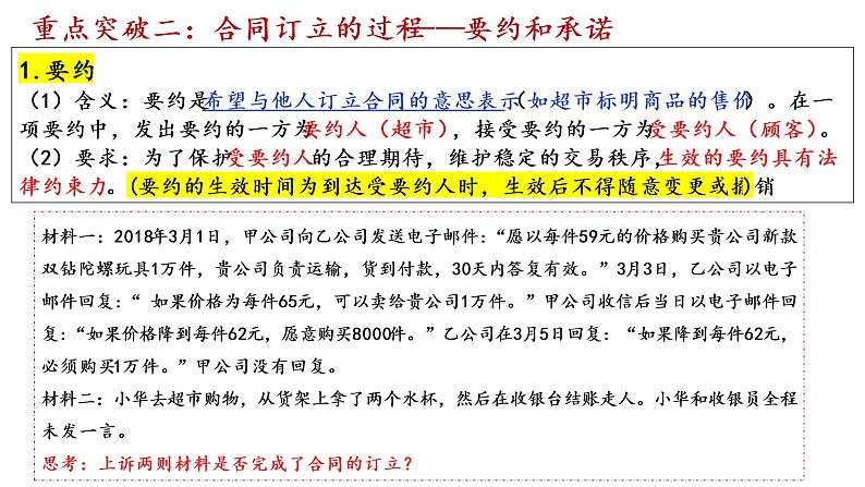 1.要约(1)含义:要约是希望与他人订立合同的意思表示(如超市标明商品的售价)。在一项要约中,发出要约的一方为要约人(超市),接受要约的一方为受要约人(顾客)。(2)要求:为了保护受要约人的合理期待,维护稳定的交易秩序,生效的要约具有法律约束力。(要约的生效时间为到达受要约人时,生效后不得随意变更或撤销)
