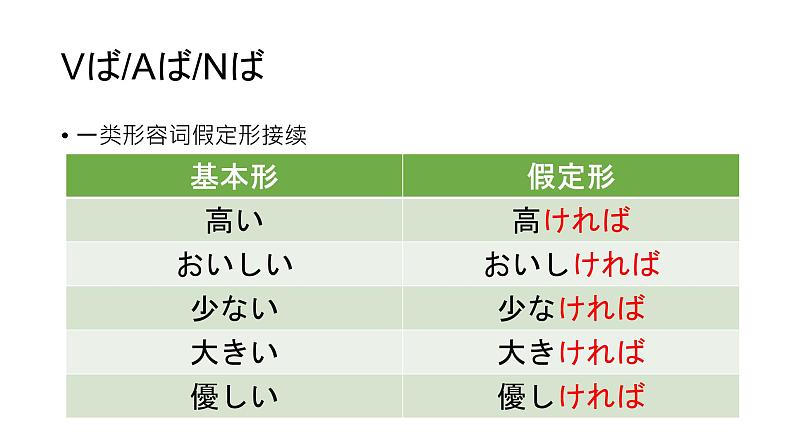 思考:表示如果。。。。用~ば假定形,那如果表示否定,如果不。。。。该怎么表达?所有的基本形改为简体否定后再依据(ない)一类形容词变形规则变形例如:聞く 聞かない 聞かなければ くる こない こなければ する しない しなければ 高い 高くない 高くなければ きれいだ きれいじゃない きれいじゃなければ