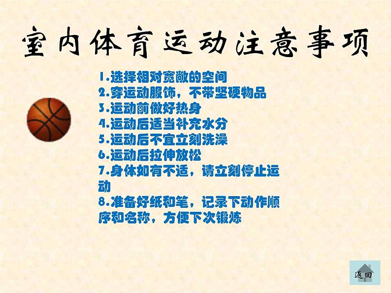 1.选择相对宽敞的空间2.穿运动服饰,不带坚硬物品3.运动前做好热身4.运动后适当补充水分5.运动后不宜立刻洗澡6.运动后拉伸放松7.身体如有不适,请立刻停止运动8.准备好纸和笔,记录下动作顺序和名称,方便下次锻炼