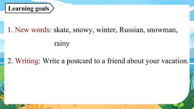 1. New wrds: skate, snwy, winter, Russian, snwman, rainy