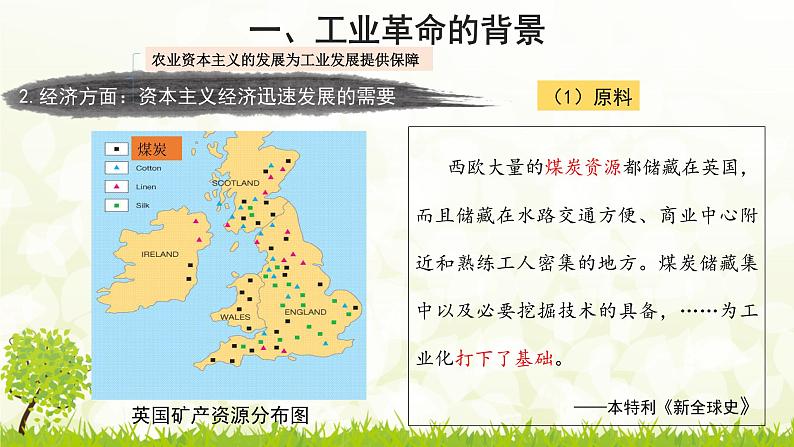 西欧大量的煤炭资源都储藏在英国,而且储藏在水路交通方便、商业中心附近和熟练工人密集的地方。煤炭储藏集中以及必要挖掘技术的具备,……为工业化打下了基础。 ——本特利《新全球史》