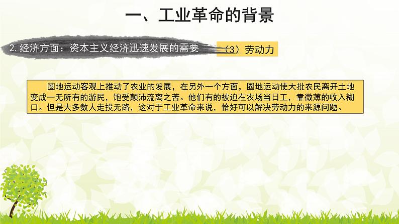 这是一份人教统编版(必修)中外历史纲要(下)第10课 影响世界的工业革命 背景图课件ppt,共38页。PPT课件主要包含了TEXT,政治前提,1原料,2资金,3劳动力,4市场,海外市场,国内市场,工业革命背景总结,劳动力等内容,欢迎下载使用。