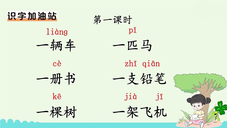 这是一份小学语文人教部编版一年级下册语文园地二图文ppt课件,共35页。PPT课件主要包含了一辆车,一匹马,一册书,一支铅笔,一棵树,一架飞机等内容,欢迎下载使用。