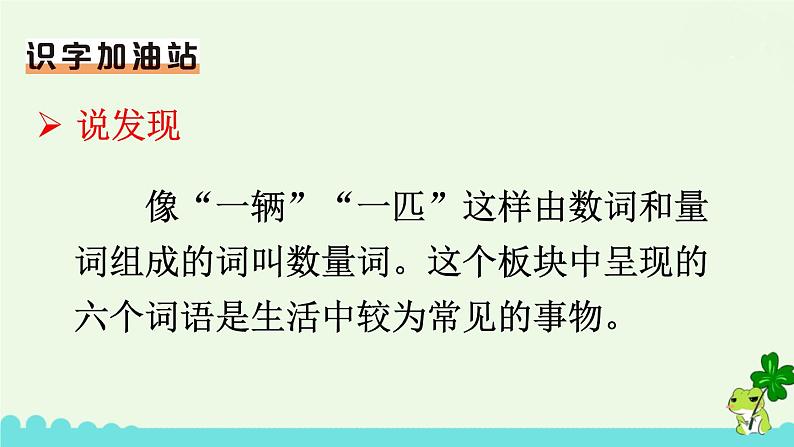 像“一辆”“一匹”这样由数词和量词组成的词叫数量词。这个板块中呈现的六个词语是生活中较为常见的事物。