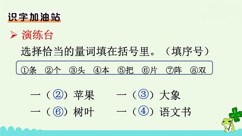 一( )苹果 一( )大象一( )树叶 一( )语文书
