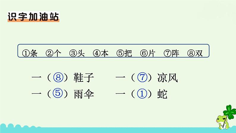 ①条 ②个 ③头 ④本 ⑤把 ⑥片 ⑦阵 ⑧双