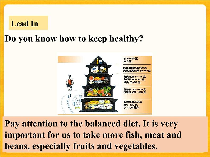 Pay attentin t the balanced diet. It is very imprtant fr us t take mre fish, meat and beans, especially fruits and vegetables.