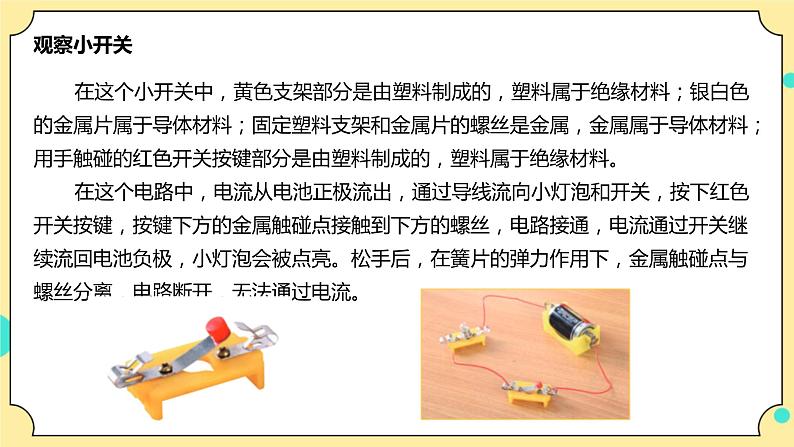 这是一份科学四年级下册7.电路中的开关图片ppt课件,共11页。PPT课件主要包含了观察小开关,做个回形针开关等内容,欢迎下载使用。