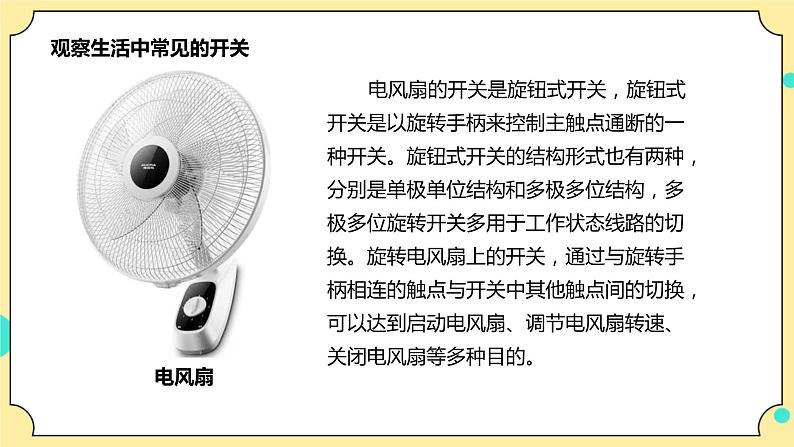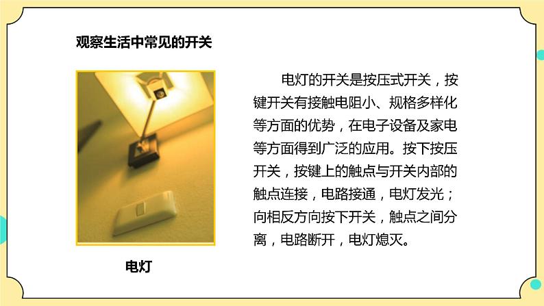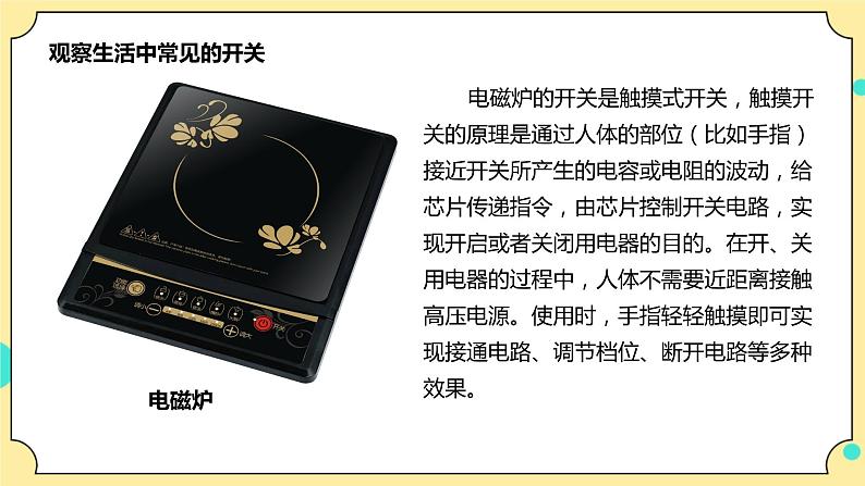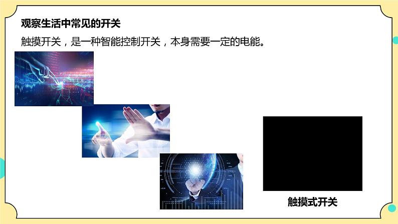 这是一份小学科学教科版 (2017)四年级下册7.电路中的开关获奖ppt课件,文件包含27《电路中的开关》课件教科版2017四年级科学下册ppt、27《电路中的开关》教案教科版2017四年级科学下册doc、27《电路中的开关》试题含解析教科版2017四年级科学下册doc、一分钟了解开关mp4、声控开关mp4、触摸开关mp4、轻触开关mp4等7份课件配套教学资源,其中PPT共23页, 欢迎下载使用。