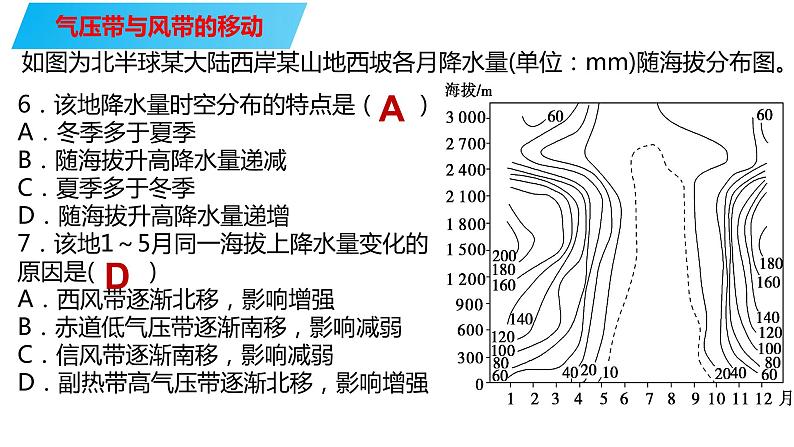 6.该地降水量时空分布的特点是( )A.冬季多于夏季B.随海拔升高降水量递减C.夏季多于冬季D.随海拔升高降水量递增7.该地1~5月同一海拔上降水量变化的原因是( )A.西风带逐渐北移,影响增强B.赤道低气压带逐渐南移,影响减弱C.信风带逐渐南移,影响减弱D.副热带高气压带逐渐北移,影响增强