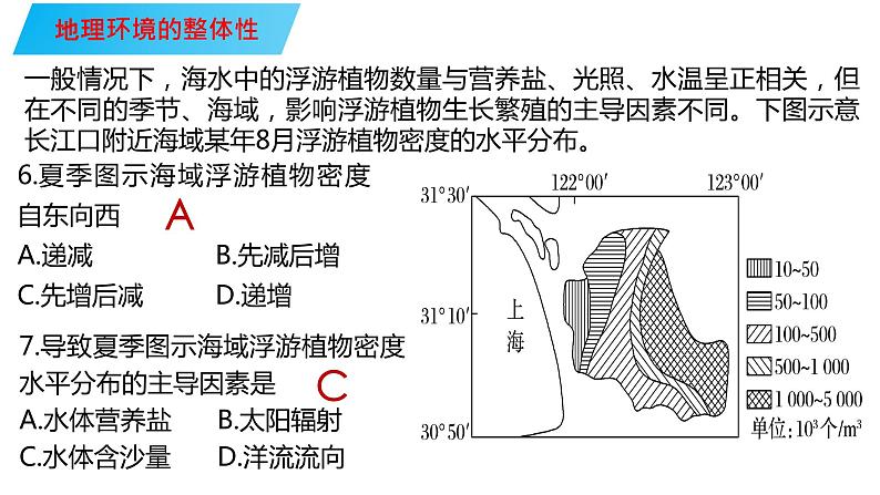 6.夏季图示海域浮游植物密度自东向西A.递减 B.先减后增C.先增后减 D.递增