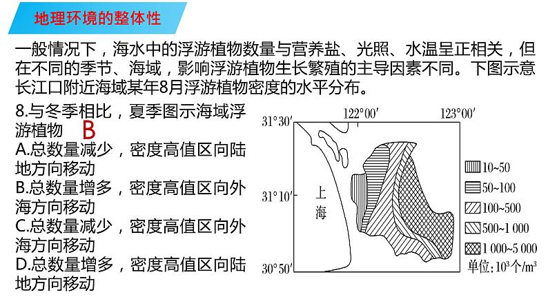 8.与冬季相比,夏季图示海域浮游植物 A.总数量减少,密度高值区向陆地方向移动B.总数量增多,密度高值区向外海方向移动C.总数量减少,密度高值区向外海方向移动D.总数量增多,密度高值区向陆地方向移动