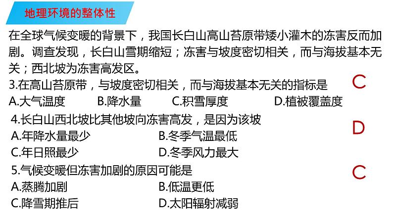 5.气候变暖但冻害加剧的原因可能是 A.蒸腾加剧 B.低温更低C.降雪期推后 D.太阳辐射减弱