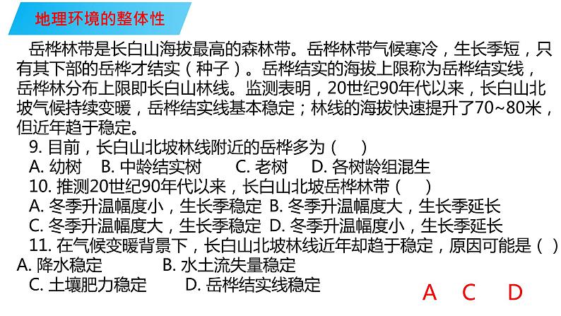 岳桦林带是长白山海拔最高的森林带。岳桦林带气候寒冷,生长季短,只有其下部的岳桦才结实(种子)。岳桦结实的海拔上限称为岳桦结实线,岳桦林分布上限即长白山林线。监测表明,20世纪90年代以来,长白山北坡气候持续变暖,岳桦结实线基本稳定;林线的海拔快速提升了70~80米,但近年趋于稳定。9. 目前,长白山北坡林线附近的岳桦多为( )A. 幼树B. 中龄结实树 C. 老树D. 各树龄组混生10. 推测20世纪90年代以来,长白山北坡岳桦林带( )A. 冬季升温幅度小,生长季稳定B. 冬季升温幅度大,生长季延长C. 冬季升温幅度大,生长季稳定D. 冬季升温幅度小,生长季延长11. 在气候变暖背景下,长白山北坡林线近年却趋于稳定,原因可能是() A. 降水稳定 B. 水土流失量稳定C. 土壤肥力稳定D. 岳桦结实线稳定
