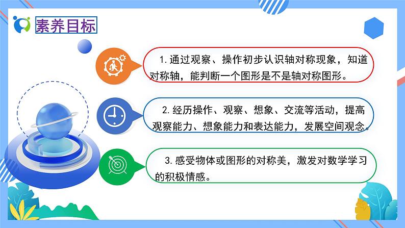 素养目标 | 1.通过观察、操作初步认识轴对称现象,知道对称轴,能判断一个图形是不是轴对称图形。 2.经历操作、观察、想象、交流等活动,提高观察能力、想象能力和表达能力,发展空间观念。 3.感受物体或图形的对称美,激发对数学学习的积极情感。 | ||