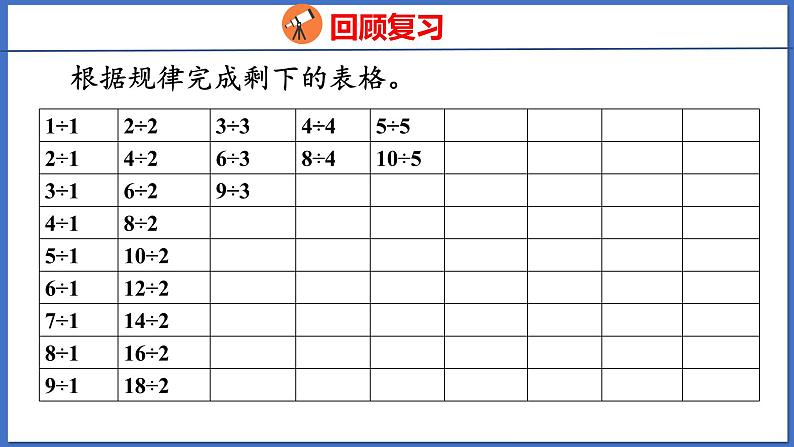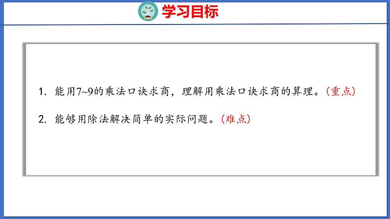 展开能用7~9的乘法口诀求商,理解用乘法口诀求商的算理。(重点)能够用除法解决简单的实际问题。(难点)