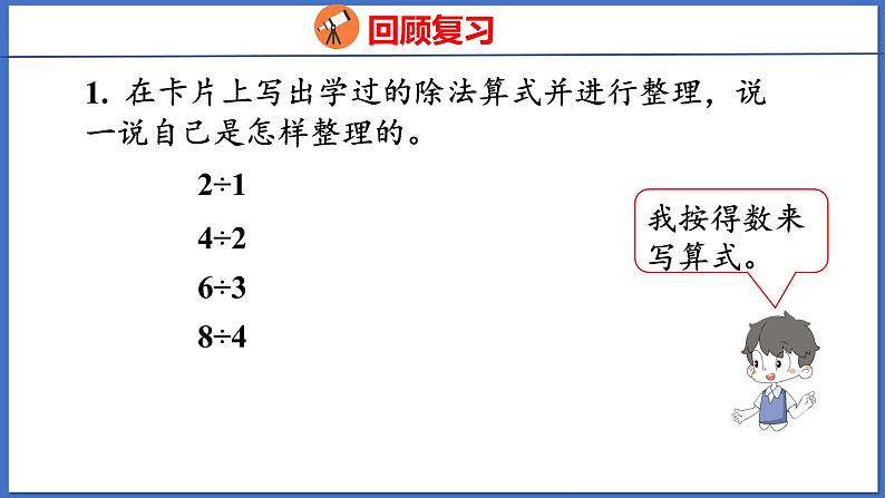 1. 在卡片上写出学过的除法算式并进行整理,说一说自己是怎样整理的。