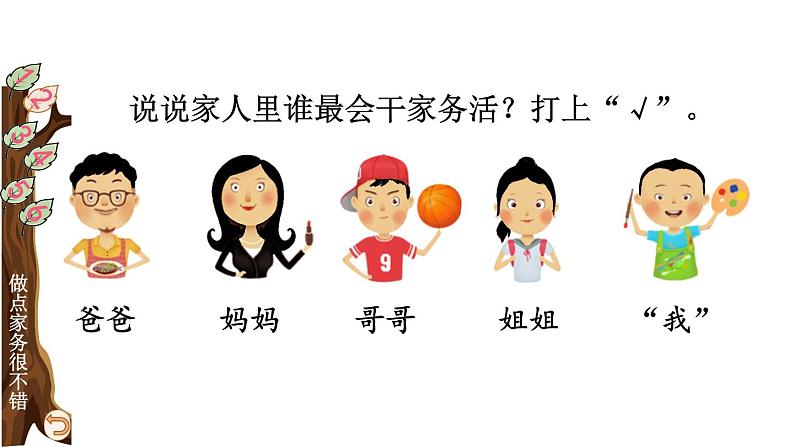 同学们,每一项家务活都有技巧和方法,要多看、多听、多学、多做。会做的经常做,不会做的学着做,渐渐地就能掌握这些技巧和方法了。