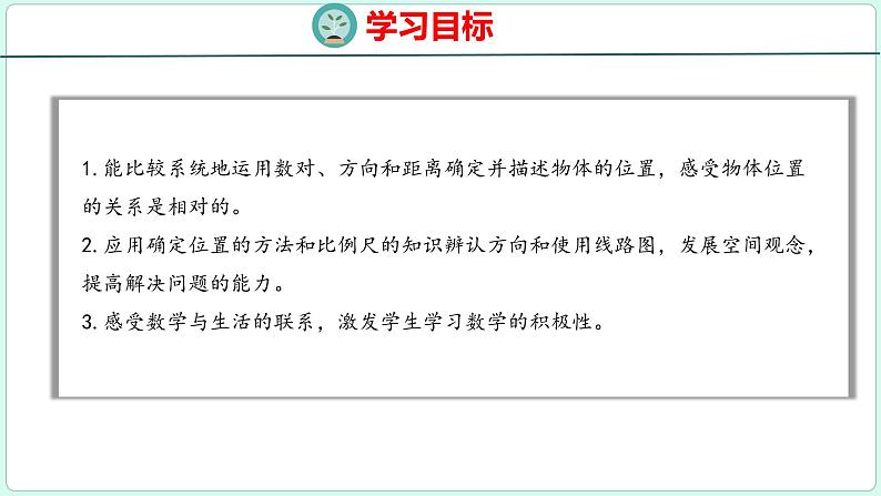 展开1.能比较系统地运用数对、方向和距离确定并描述物体的位置,感受物体位置的关系是相对的。2.应用确定位置的方法和比例尺的知识辨认方向和使用线路图,发展空间观念,提高解决问题的能力。3.感受数学与生活的联系,激发学生学习数学的积极性。