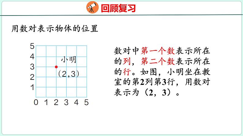 数对中第一个数表示所在的列,第二个数表示所在的行。如图,小明坐在教室的第2列第3行,用数对表示为(2,3)。