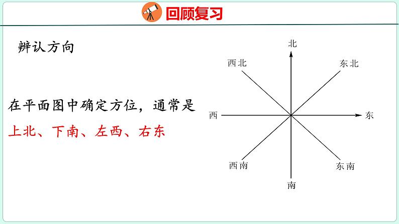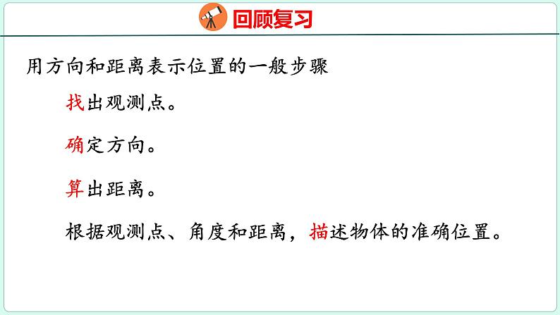 用方向和距离确定位置时,一定要先找准物体或地点所在的方向区域,一般先说夹角的方向。