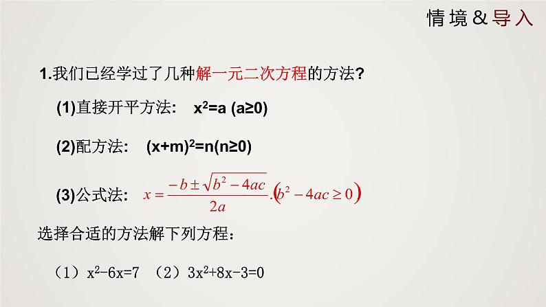 合理选择一元二次方程的解法1.当没有一次项时(ax2+c=0),应选用直接开平方法;2.若没有常数项时(ax2+bx=0),应选用因式分解法;3.若一次项系数和常数项都有 (ax2+bx+c=0),先化为一般式,若一边的整式容易因式分解,则选用因式分解法;若不容易分解,则选用公式法;4.若二次项系数是1,且一次项系数是偶数时,可选用配方法.