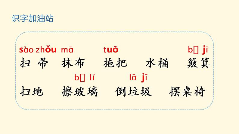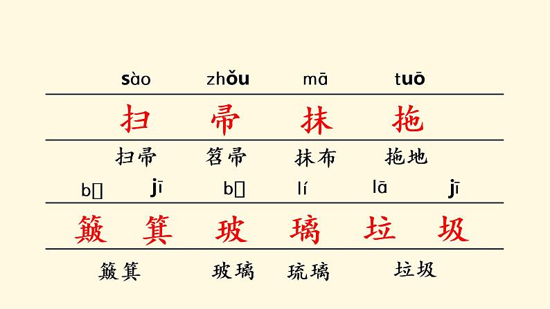 观察“簸箕”“玻璃”“垃圾”几个词,说说它们的特点。