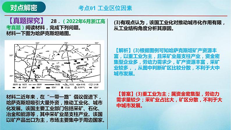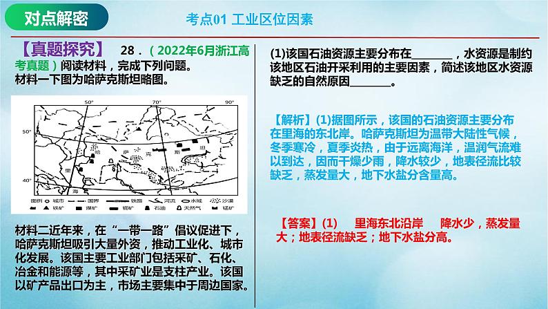 【真题探究】 28.(2022年6月浙江高考真题)阅读材料,完成下列问题。材料一下图为哈萨克斯坦略图。材料二近年来,在“一带一路”倡议促进下,哈萨克斯坦吸引大量外资,推动工业化、城市化发展。该国主要工业部门包括采矿、石化、冶金和能源等,其中采矿业是支柱产业。该国以矿产品出口为主,市场主要集中于周边国家。