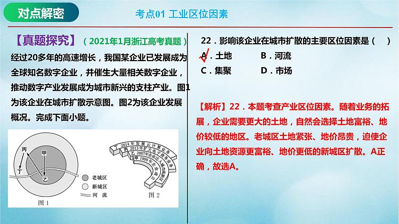 【解析】22.本题考查产业区位因素。随着业务的拓展,企业需要更大的土地,自然会选择土地富裕、地价较低的地区。老城区土地紧张、地价昂贵,迫使企业向土地资源更富裕、地价更低的新城区扩散。A正确,故选A。