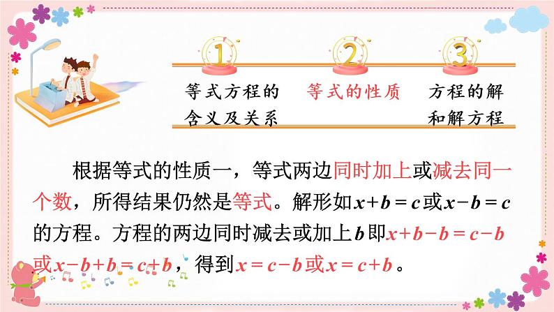 根据等式的性质一,等式两边同时加上或减去同一个数,所得结果仍然是等式。解形如x+b=c或x−b=c的方程。方程的两边同时减去或加上b即x+b−b=c−b或x−b+b=c+b,得到x=c−b或x=c+b。