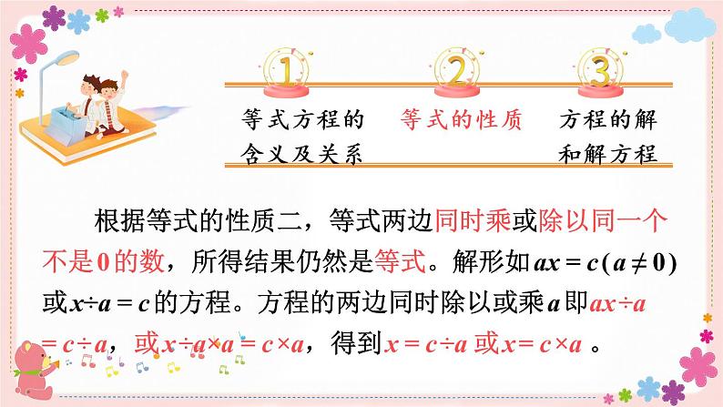 根据等式的性质二,等式两边同时乘或除以同一个不是0的数,所得结果仍然是等式。解形如ax=c(a≠0)或x÷a=c的方程。方程的两边同时除以或乘a即ax÷a =c÷a,或x÷a×a =c×a,得到x=c÷a或x=c×a 。